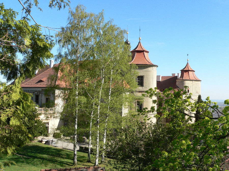 obklopen parkem. Výhled na část krajiny Podkrušnohoří zachycuje