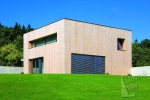 Název domu de facto klame, neboť dřevěný je pouze obklad, ale název je oprávněný z hlediska semperovské teorie „odívání“ architektury. Gottfried Semper dává textilu, stavebně řečeno tedy omítce či obkladu, zásadní roli při vzniku architektury. Hloubkově mořené, vertikálně kladené obložení doplňuje na pohledově méně exponovaných stranách betonová stěrka. Dřevo i kontextuálně souzní s nedalekým lesem, neboť dům se nachází pod východním zalesněným svahem Ještědského hřbetu. Avšak spojení s architektonickým regionalismem bychom zde našli stěží. Dům se nekompromisně hlásí k abstraktně-geometrické estetice, k hledání čisté, možná až přísné krásy. Autorka Jana Medlíková (1976) patří k mladší generaci architektů, podílela se však již, mimo jiné, na zařízení interiérů libereckého magistrátu a na návrhu libereckého Intersparu. Takže rozsah druhů realizací je u ní velice široký. V případě tohoto domku zněl požadavek na bydlení pro rodinu s dvěma malými dětmi a proto dům též leží v obytné zahradě, nedaleko od lesa. Od vjezdu, kde jsou umístěny i stání pro auta, dojdeme pěšinou k domu. Zastřešené předdveří je rámováno domovní stěnou a na druhé straně opěrnou zítkou z pohledového betonu. Z malé předsíňky vstoupíme do schodišťové haly, umožňující příchod do obývacího pokoje nebo do tzv. herny. Obývací pokoj, spojený s kuchyňským koutem, má díky velkému obdélnému oknu zprostředkován krásný výhled na Liberec a Jizerské hory. Zastínění zajišťují venkovní horizontální žaluzie. Centrálním prvkem pokoje je krb, umístěný téměř přesně ve středu domu. Halu, obývací pokoj a hernu oddělují posuvné dveře, takže jejich zasunutím lze vytvořit téměř jednotný kontinuální prostor. Vnitřní stěny jsou též z pohledového betonu, pojednáním se velice blíží betonovým stěnám ve stavbách, které navrhl japonský architekt Tadao Ando. Celkové řešení interiéru, i díky posuvným dveřím, evokuje japonské pojetí prostoru a estetiky. K schodišťové hale, která zprostředkovává spojení přízemí s patrem, přiléhají koupelna a technická místnost. V patře se nacházejí vedle další koupelny a samostatného WC hlavně pracovna, ložnice rodičů a dětský pokoj. Ten je možno dle potřeby rozdělit na dvě samostatné místnosti. Přirozené osvětlení tohoto prostoru zajišťuje pásové okno, směřující k jihu. Dům má dřevěný výraz, ale konstrukčně jde o stěnový nosný systém, kombinující porothermové zdivo a železobeton. Strop nad přízemím tvoří železobetonová deska, střecha je nesena dřevěnými nosníky položenými do betonového věnce. Vyspádování by mělo zabránit problémům s dešťovou vodou a hlavně s tajícím sněhem. Vytápění domu zajišťuje tepelné čerpadlo systému země-voda, které v případě potřeby doplňuje výše zmíněný centrální krb.