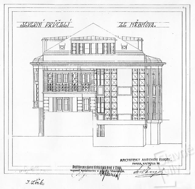 V letech 1893 až 1917 se uskutečnil jeden z nejvýznamnějších i nejproblematičtějších urbanistických projektů v novodobých dějinách Prahy. Byla jím asanace a přestavba Josefova (dříve Židovského Města) a části Starého Města. Osu asanovaného pásma tvořila Pařížská ulice, v souvislosti s tím se naskytla myšlenka propojení Bubenče a Dejvic přes Letnou s vnitřní Prahou.Ve veřejné soutěži roku 1909 zvítězili Antonín Engel a Josef Šejna s kombinací průkopu a krátkého tunelu. Antonín Engel (1879 až 1958) se uskutečnění svého záměru nedočkal, stejně jako žádný z jeho kolegů; tunel na Letnou byl později vybudován v ose ulice Revoluční. Nicméně do osudu asanačního pásma se zřetelně zapsal projektem vily v Břehové ulici ve slohu wagnerovské moderny. Dvoupodlažní dům je zasazený do nároží Starého židovského hřbitova. Fasáda ve stylu klasicizující moderny se vyznačuje geometrickými prvky - kosočtverci a diagonálami. Střecha je stanová s mansardovými okny. Parter i schodiště zdobí elegantní obklady z černého mramoru. V následujících letech se architekt a urbanista Antonín Engel prosadil jako autor monumentálních neoklasicistních veřejných budov a jako tvůrce urbanistických projektů (především Dejvic).