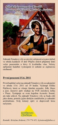 Zahrada Trmalovy vily se otevírá veřejnosti a to pravidelně ve středu každých 14 dní! Přijďte strávit příjemný večer u kávy či kvalitního vína. První posezení se koná již ve středu 15. 6. od 19 hodin. Večer bude doprovázet Eliška Ptáčková krásným zpěvem a hrou na kytaru.